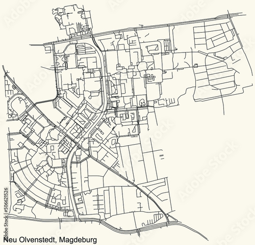 Fototapeta premium Detailed navigation black lines urban street roads map of the NEU OLVENSTEDT DISTRICT of the German regional capital city of Magdeburg, Germany on vintage beige background