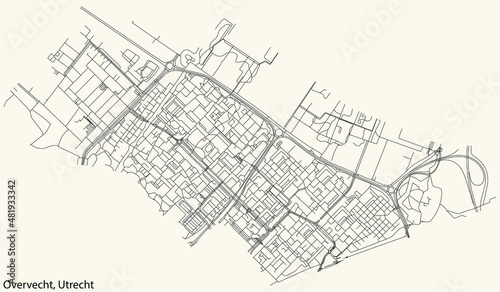 Fototapeta premium Detailed navigation black lines urban street roads map of the OVERVECHT QUARTER of the Dutch regional capital city Utrecht, Netherlands on vintage beige background