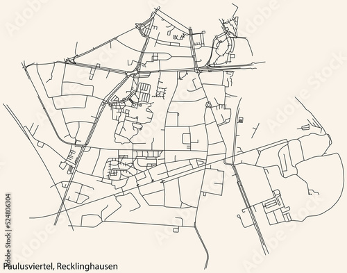 © Momcilo, Naklejka premium Detailed navigation black lines urban street roads map of the PAULUSVIERTEL DISTRICT of the German regional capital city of Recklinghausen, Germany on vintage beige background