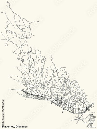 © Momcilo, Fototapeta premium Detailed navigation black lines urban street roads map of the quarter BRAGERNES MUNICIPALITY of the Norwegian regional capital city of Drammen, Norway on vintage beige background