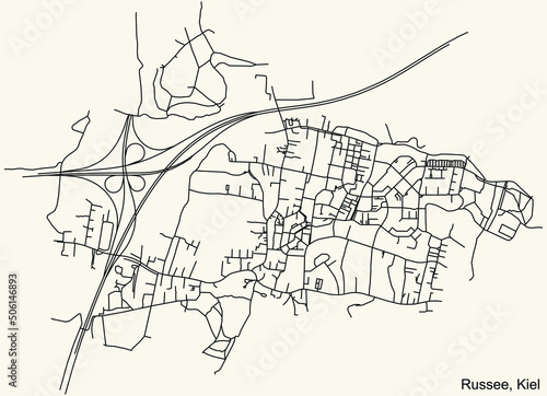 © Momcilo, Fototapeta premium Detailed navigation black lines urban street roads map of the RUSSEE DISTRICT of the German regional capital city of Kiel, Germany on vintage beige background