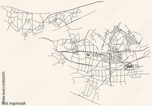 © Momcilo, Naklejka premium Detailed navigation black lines urban street roads map of the SÜD DISTRICT of the German regional capital city of Ingolstadt, Germany on vintage beige background