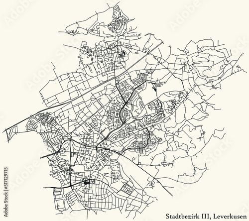 Fototapeta premium Detailed navigation black lines urban street roads map of the STADTBEZIRK III BOROUGH of the German regional capital city of Leverkusen, Germany on vintage beige background