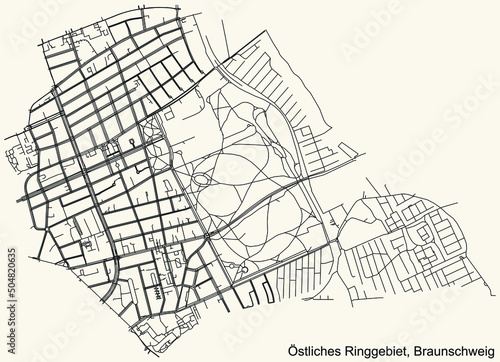 © Momcilo, Fototapeta premium Detailed navigation black lines urban street roads map of the ÖSTLICHES RINGGEBIET DISTRICT of the German regional capital city of Braunschweig, Germany on vintage beige background