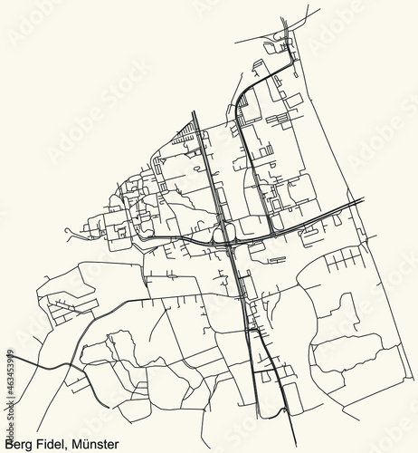 © Momcilo, Fototapeta premium Detailed navigation urban street roads map on vintage beige background of the quarter Berg Fidel district of the German capital city of Münster-Muenster, Germany
