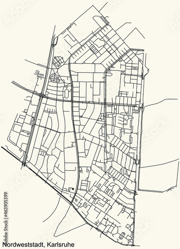 Naklejka premium Detailed navigation urban street roads map on vintage beige background of the quarter Nordweststadt district of the German regional capital city of Karlsruhe, Germany