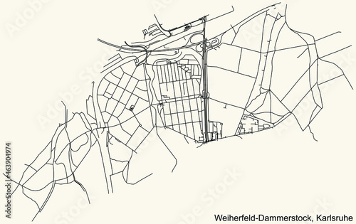 Naklejka premium Detailed navigation urban street roads map on vintage beige background of the quarter Weiherfeld-Dammerstock district of the German regional capital city of Karlsruhe, Germany