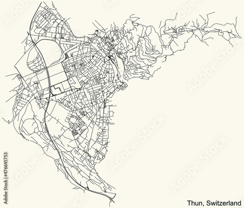 © Momcilo, Fototapeta premium Detailed navigation urban street roads map on vintage beige background of the Swiss regional capital city of Thun, Switzerland