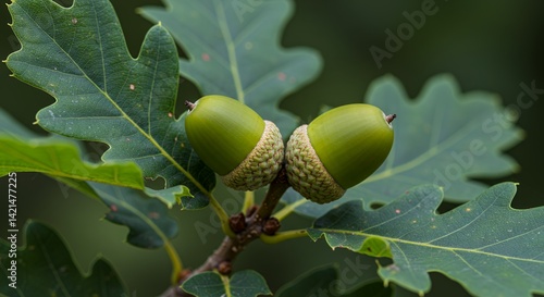 © avissarahmanita, Obraz premium Detailed Oak Acorn Development Emphasizing Leaf Lobes in Natural Setting