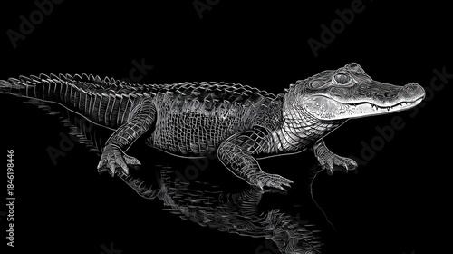 © Thinnawat, Naklejka premium Detailed Outline of a Crocodile Against a Black Background