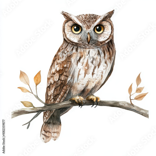 © praewpailyn, Fototapeta premium detailed owl perched on branch, showcasing its striking features and natural colors. This illustration captures essence of wildlife in serene forest setting