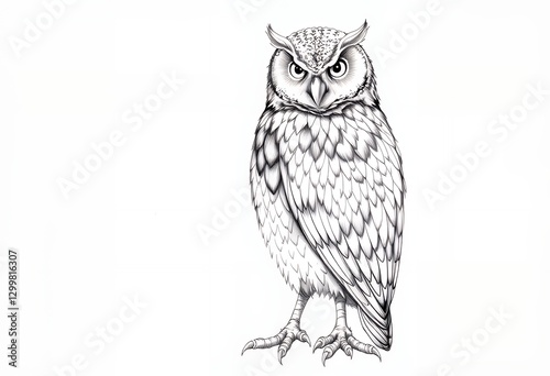 Fototapeta premium Detailed Owl Standing Sketch Drawn with Fine Lines on White Background