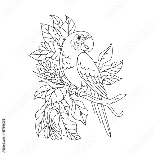 Obraz premium Detailed parrot perched on a branch, with beautiful floral and foliage elements, perfect for creative coloring projects.