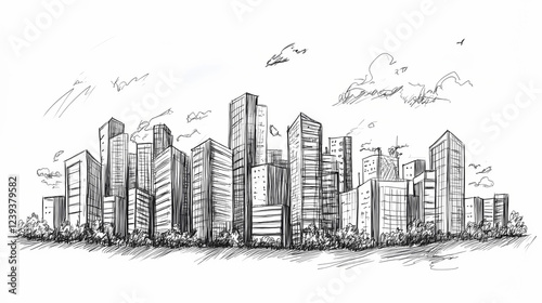 Fototapeta premium Detailed pen-and-ink cityscape sketch, architectural style. Architectural Style. Illustration