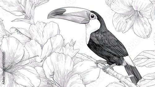 Fototapeta premium Detailed pencil sketch of a toucan perched on a branch amidst hibiscus blossoms, rendered in grayscale with intricate linework
