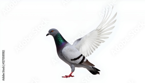 Obraz premium Detailed Photorealistic Pigeon in Flight Against White Background