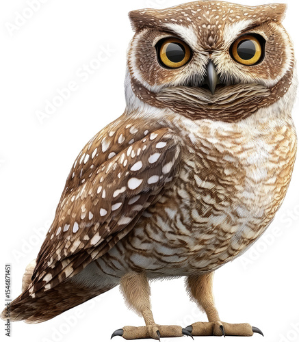 © NikahGeh, Naklejka premium Detailed Portrait of a Burrowing Owl with Intense Gaze on White Background