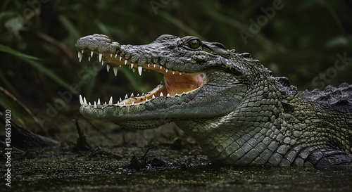 Fototapeta premium Detailed portrait of a crocodile with jaws wide open showcasing its sharp teeth