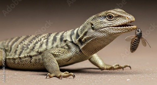 © Niril, Fototapeta premium Detailed portrait of a predatory lizard with its insect prey in its mouth