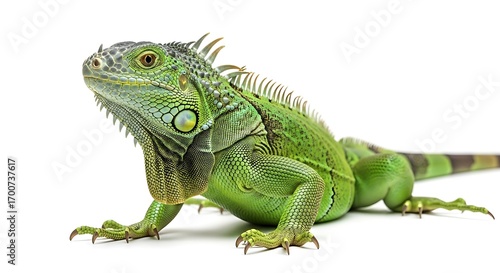 © Garin, Obraz premium Detailed portrait of a vibrant green iguana against a stark white background showcasing its