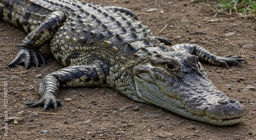 © Firman Dasmir, Obraz premium Detailed Portrait of a Wild Crocodile Resting Peacefully on Brown Earth