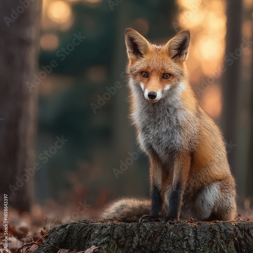 © Zander, Naklejka premium Detailed Portrait of a Wild Red Fox Sitting in a Forest at Sunset