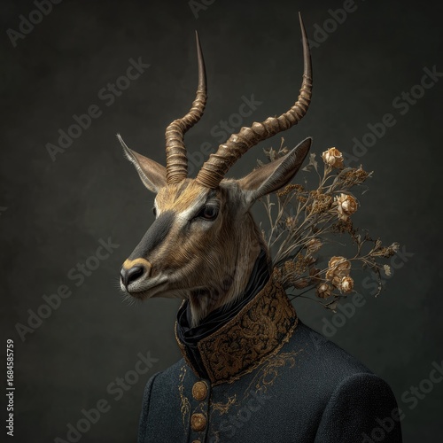 © Anakanak, Fototapeta premium Detailed portrait of an antelope-like creature, wearing a richly decorated military-style jacket. Dried floral sprigs adorn its neck. Dark background