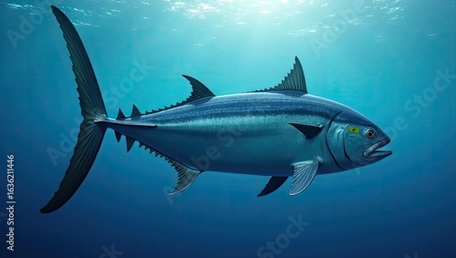 Obraz premium Detailed profile of a tuna fish swimming in deep water.