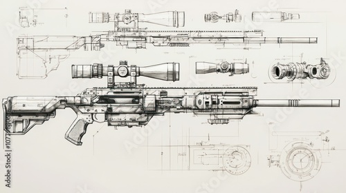 © Hardy, Obraz premium Detailed rendering of a weapon's sights and optics, including iron sights, scopes, and mounting systems in technical detail