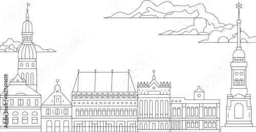 Fototapeta premium Detailed Riga Skyline Outline Vector Illustration Depicting Cityscape with Architectural Landmarks