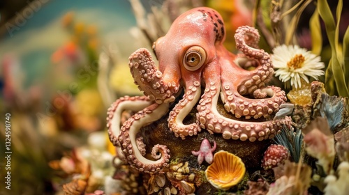 Naklejka premium Detailed sculpted octopus, coral reef scene