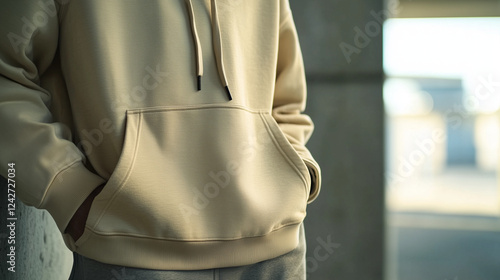 © Septhian, Naklejka premium Detailed shot of a beige hoodie’s front pocket and drawstrings, emphasizing fabric quality and craftsmanship. Perfect for apparel branding, e-commerce, and promotional mockups.