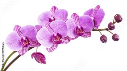 © ArpPSIqee, Fototapeta premium Detailed shot of a cluster of purple orchid flowers with intricate patterns, isolated white background, minimalistic composition