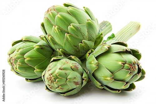 © ckybe, Obraz premium Detailed shot of a complete artichoke, also referred to as the French, green, or globe variety, on a plain backdrop.