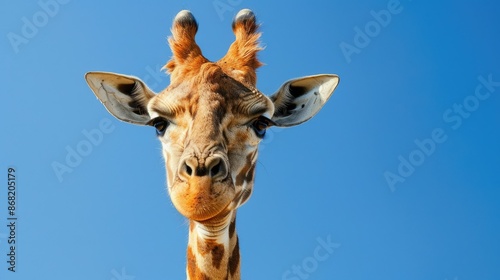 © Matcha_09, Naklejka premium Detailed shot of a giraffe face against the bright blue sky of the African savannah