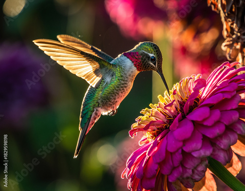 © SolaruS, Fototapeta premium Detailed shot of a hummingbird feeding on a vibrant pink flower. Excellent for themes of nature, wildlife, beauty, and springtime. Evokes feelings of joy and wonder.