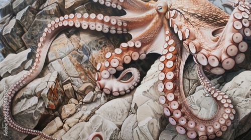 Fototapeta premium Detailed shot of an octopus' tentacles as it maneuvers over a rocky landscape, exploring its territory. --