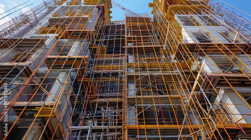 © Aeman, Fototapeta premium detailed shot of scaffolding and safety netting surrounding a high-rise building under construction