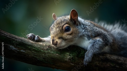 © Jojo*, Obraz premium Detailed shows a furry rodent resting on a weathered tree branch