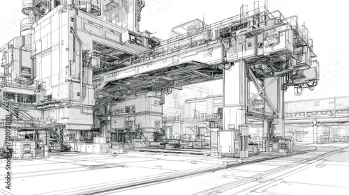 Obraz premium Detailed sketch of a large, futuristic industrial complex with intricate architectural details
