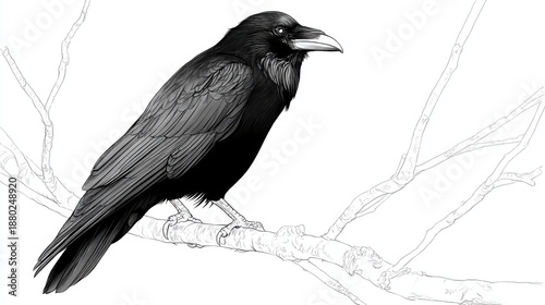 © Thinnawat, Fototapeta premium Detailed Sketch of a Raven Perched on a Branch in Black and White