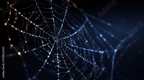 © Lee, Naklejka premium Detailed Spider Web with Dew Drops on a Dark Background