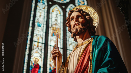 Fototapeta premium detailed statue of religious figure stands front of stained glass window,...