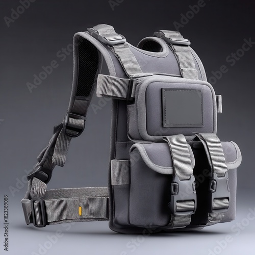 Naklejka premium Detailed tactical vest with zebra pattern accents and multiple pouches against a neutral gray backdrop.