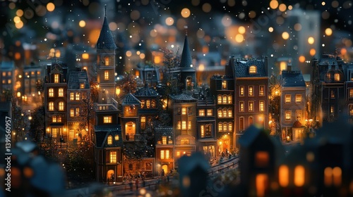 © Abba, Obraz premium Detailed townhouses glow warmly at night under soft bokeh lights. Perfect for holiday promotions, cozy home blogs, or story illustrations.