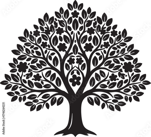 Fototapeta premium Detailed Tree Illustration, Black and White Tree Drawing, Intricate Leaf Design, Botanical Art, Monochrome Nature Sketch