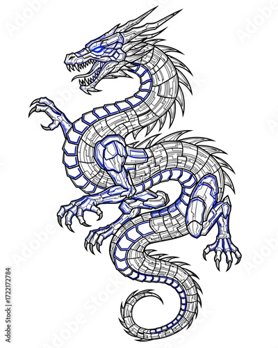 © SelenicReign, Obraz premium Detailed Vector Illustration of a Futuristic Mechanical Dragon with Bright Blue Eyes and Intricate Robotic Scales, a Powerful Fantasy Creature Concept Design for Gaming and Sci-Fi Themes