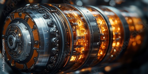 © BYAI, Obraz premium Detailed view of a complex engine component showcasing intricate design and glowing elements