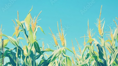 © วรรณภา มะโนศรี, Fototapeta premium Detailed view of a cornfield with tall stalks and ripe corn ears, under a bright blue sky