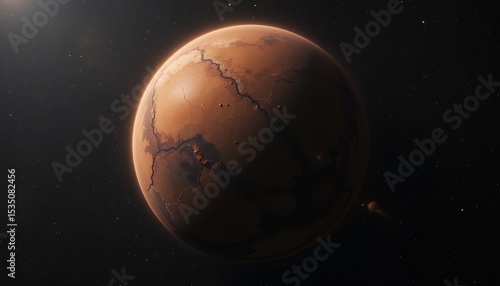 © Pungkas, Fototapeta premium Detailed view of a cracked and barren red planet in outer space with distant celestial bodies